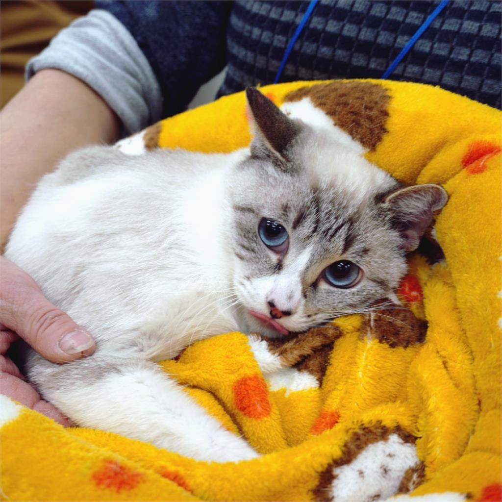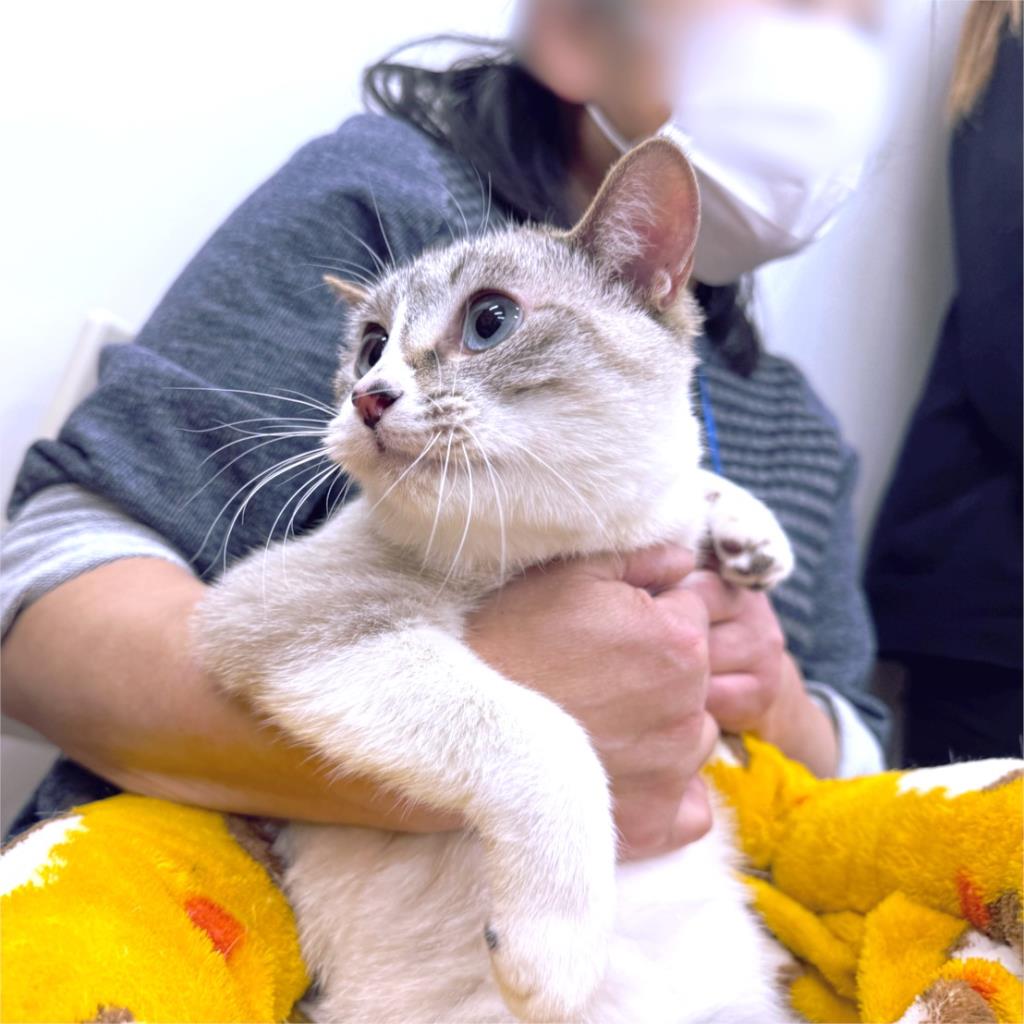 静かで穏やかな環境を好む女の子です。青い瞳が美しく、マイペースな性格が魅力です。保護当初は緊張していましたが、現在は家の中でリラックスして過ごしています。新しい場所には少し戸惑うかもしれませんが、順応性が高いので安心です。日々のんびりと過ごしたい、という方にぴったりの猫です。